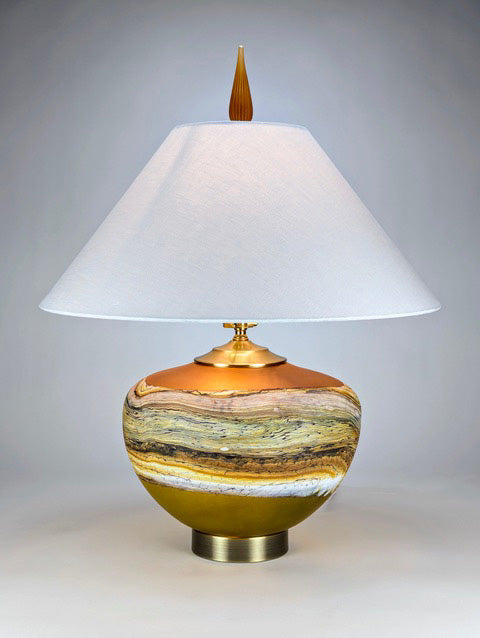 GartnerBlade hand blown glass table lamp with glass finial. Translucent sand blasted finish with strata accents in tangerine and lime color.